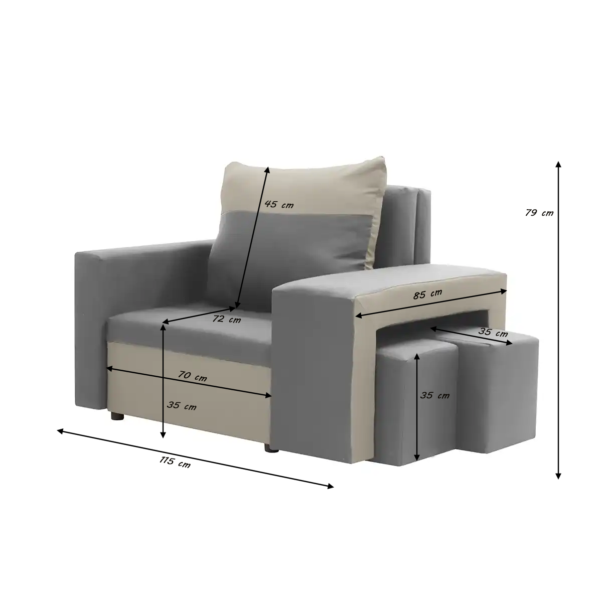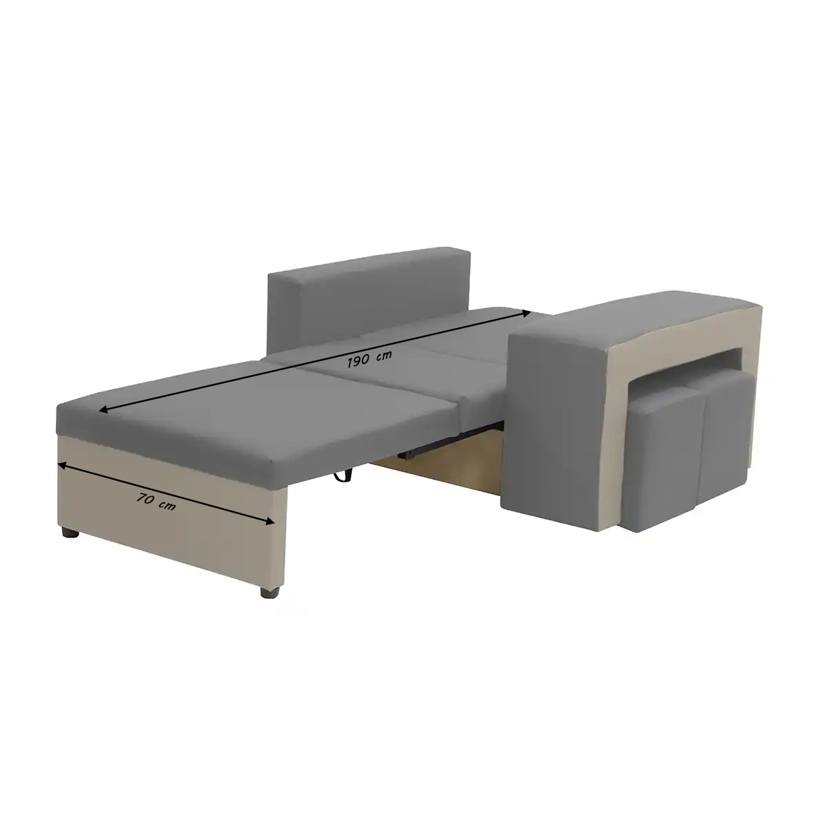 Křeslo má funkci na spaní – po rozložení nabízí pohodlnou odpočinkovou plochu o rozměrech 190 × 70 cm. Další výhodou je kontejner na lůžkoviny, který je umístěn ve spodní části nábytku a umožňuje praktické uložení peřiny, polštáře nebo přikrývky.